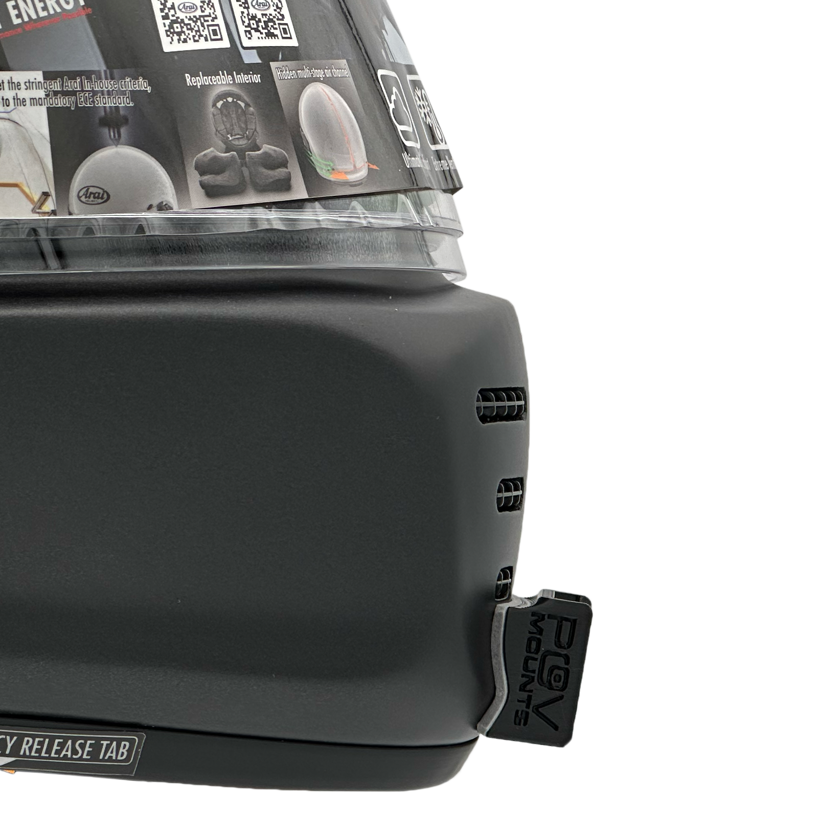 Inside the packaging you'll find your POV Mount, which naturally comes with 3M double-sided tape, the same type used on GoPro, Insta360, and similar accessories. The packaging also includes wipes to properly clean your helmet, along with a safety tether for track use where required by regulations.